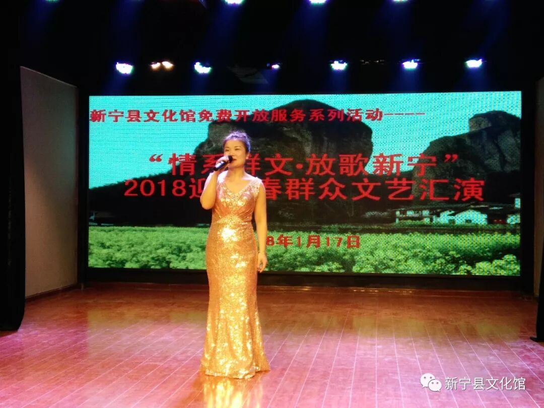 喜迎新春,丰富群众文化生活,新宁县文化馆于2018年1月17日下午在文化馆多功能厅,举办“情系群文·放歌新宁”2018迎新春群众文艺汇演活动。此次汇演吸引众多群众前来观看,全场爆满。