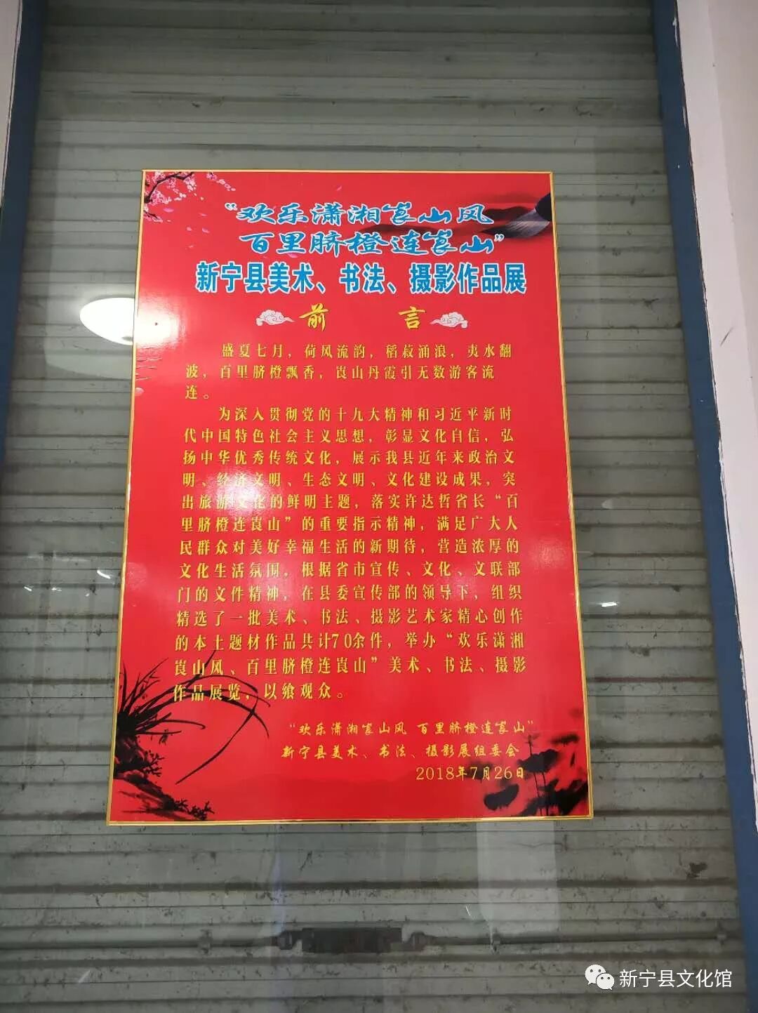 为深入贯彻党的十九大精神、习近平新时代中国特色社会主义思想,展现新宁县近年来政治文明,精神文明,生态文明,文化建设成果,新宁县文体广电新闻出版局结合省、市第六届艺术节,欢乐潇湘省运之光相关活动要求与精神,在7月26日至7月28日,于县文化馆免费开放大厅举行“欢乐潇湘崀山风,百里脐橙连崀山”美术、书法、摄影作品展。