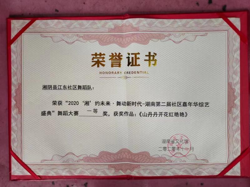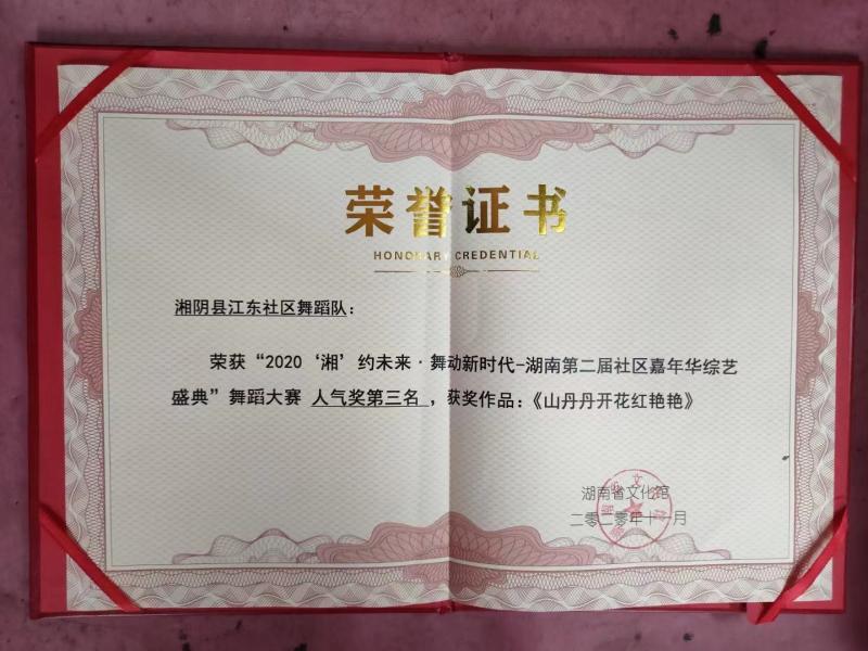 2020“湘”约来舞动新时代湖南第二届社区嘉年华综艺盛典(舞蹈)总决赛暨颁奖典礼,今天上午九点半在省文化馆音乐厅开幕,全省有各个地区十六支队伍参赛!由湘阴县文化馆选送,文星镇街道江东社区舞蹈队表演的民族舞《山丹丹花开红艳艳》,荣获一等奖,人气奖,组织奖三项好成绩,江东社区舞蹈队被湖南大剧院聘为群众文化活动储备团队!