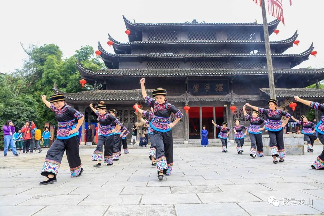 锣鼓铿锵,歌声嘹亮,秦旗与龙凤旗交相辉映,秦文化与土家文化相融一堂。祖先从这里走出森林,祖先在这里辟土开疆。敢为人先是土家人的民族性格,崇祖家国是土家人的社会风尚。