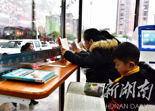 3月9日,蓝山县三蓝广场24小时自助图书馆,孩子们在玻璃书屋内认真读书。玻璃材质的墙壁,将热闹喧嚣的广场和安静的书屋分隔成两个截然不同的世界,为人们提供一个供大脑充电和心灵休憩的绝佳处所。