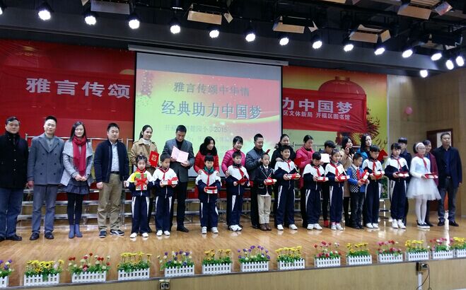 经典诗文,是文化宝库中璀璨的明珠,是人类伟大的精神财富。为倡导全民阅读,营造书香社会,2016年新年伊始,上午九点在田家炳实验中学学术大厅举行“雅言传颂中华情 经典助力中国梦”诵读活动,本次活动由开福区文体新局图书馆主办,开福区望麓园小学承办。