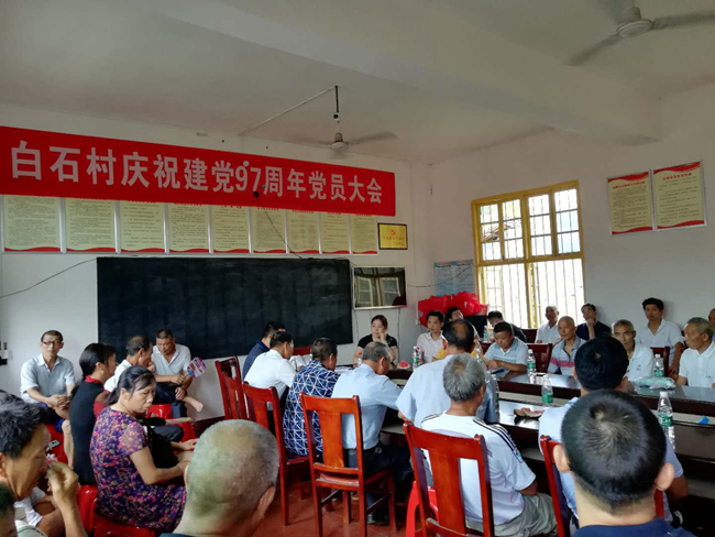 当天,白石村谭云成书记、扶贫工作队第一书记陈红艳组织白石村全体党员干部召开庆祝建党97周年党员大会,倪秋华镇长、政法委书记向立出席此次会议。会议在谭云成书记的带领下,回顾了中国共产党建党97年来取得的辉煌成就,激发广大党员干部群众的爱国、爱党意识。