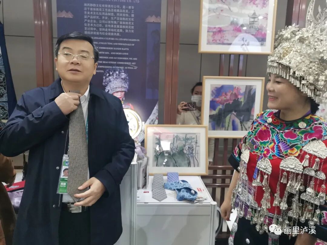 滕静蓉向参观者热情介绍苗族挑花文创产品。