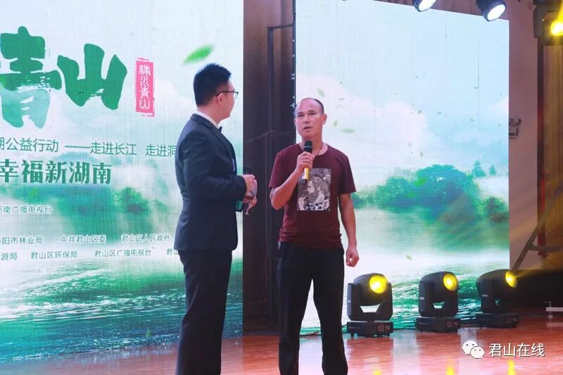 活动现场,守护洞庭湖的君山环保志愿者们分享绿水青山的努力和梦想:他们中有为了配合开展空心房整治和堤外复垦复绿工作从外滩巴垸搬迁到堤内的86岁的君山区广兴洲镇洪市居民陈福保;有日夜驻守在华龙湿地林阁老监测点的监测员邓铁牛;有为了加快生态农业转型,主动进行生猪退养的君山区柳林洲街道黄泥套村主任晏美军……