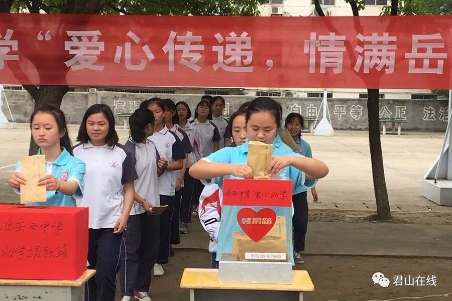 “只要人人都献出一点爱,世界将变成美好的人间……”5月27日,深情的歌声传遍整个岳西中学校园,该校“传递爱心,情满岳西”爱心助学捐款活动在《爱的奉献》歌声中进行。在彭诗羽同学向全校师生发出了“传递爱心,一个也不能少”的诚挚倡议后,该校师生献出爱心贫困助学捐款12000多元,用于资助贫困学生的学习和生活,让孩子们感受到了来自校园的温暖。
