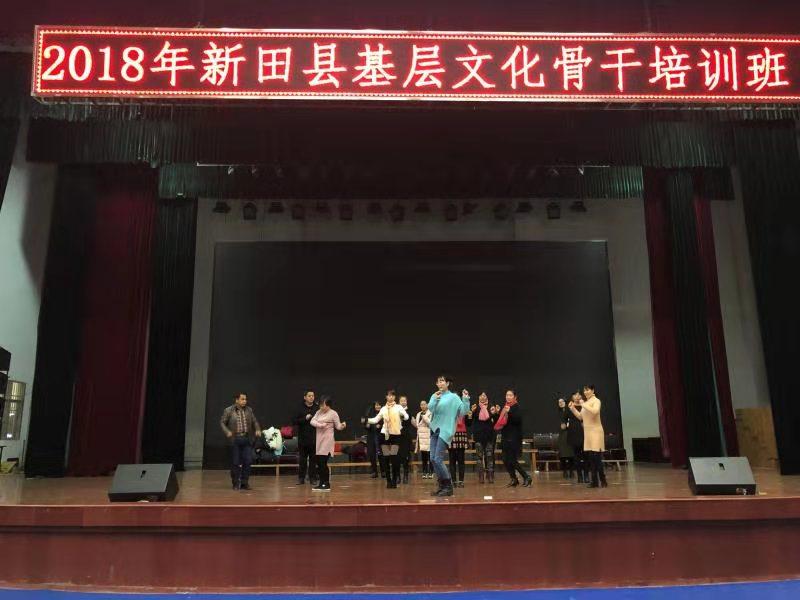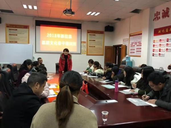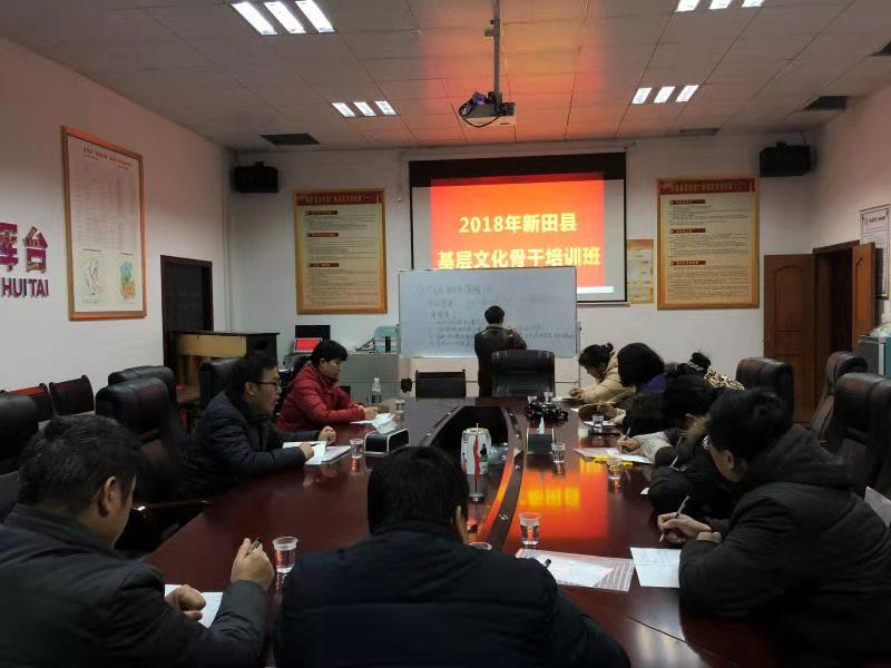 2018年12月26日上午,新田县基层文化骨干培训班在县文化馆正式开班,这次培训的学员是来自全县各乡镇的文化辅导员、社区和贫困村的文艺骨干。培训课程时间为12月26日至28日。培训课程有音乐类乐理知识、舞蹈剧目编排、非遗保护和传承、公共文化服务保障等内容。
