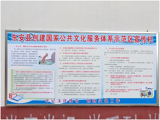 下一步,东安县继续通过媒体宣传、社会宣传、活动宣传三方面入手,努力构建“全方位、立体式、多项式、广覆盖”的宣传格局,提高广大民众的知晓率、支持率和满意度,为我县“创区”工作打下坚定的工作基础和群众基础,让全县人民加入到“创区”队伍中来,集思广益、群策群力,共同为东安县创建国家公共文化服务体系示范区而奋斗。