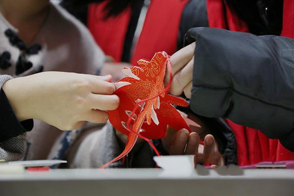 “剪纸是在西汉造纸术发明后兴起的,唐朝最为兴盛。2006年,剪纸艺术列入第一批国家级非物质文化遗产名录。它看起来很复杂,其实操作起来并不难,来,大家仔细看。”剪纸老师一边向大家讲述剪纸的历史,一边向大家传授剪纸技巧。