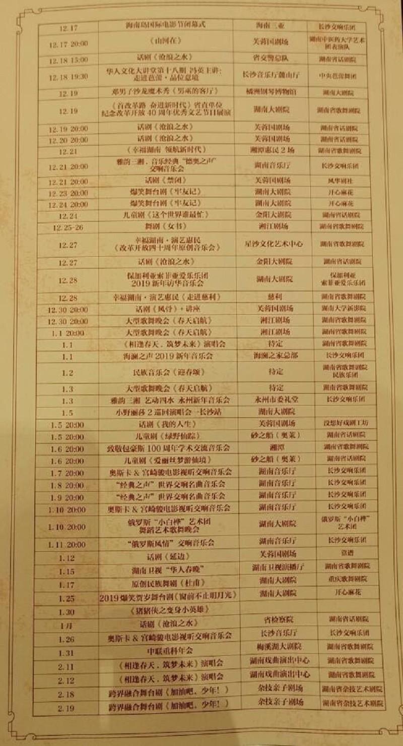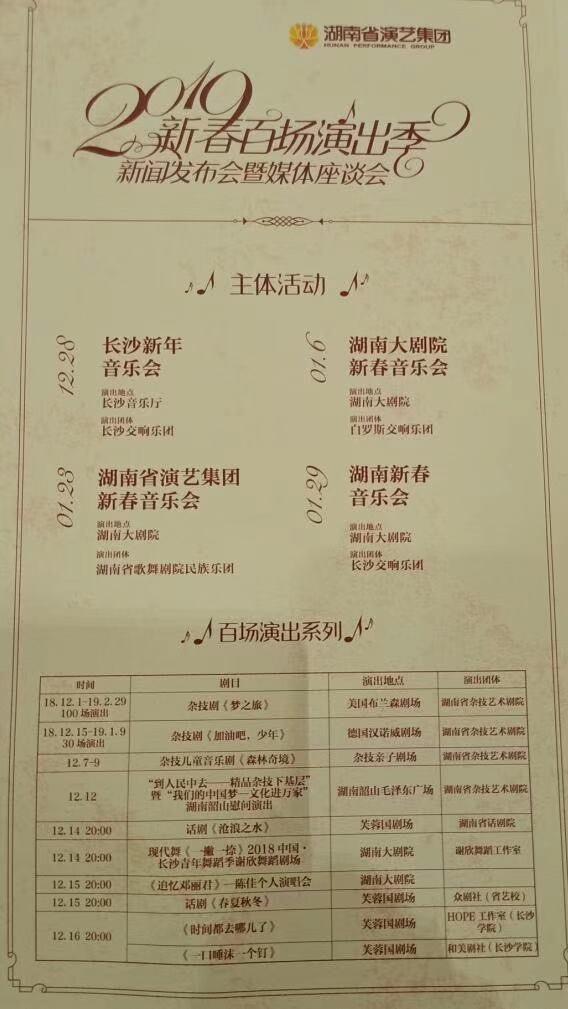 12月20日,湖南省演艺集团宣布启动新春百场演出季。2019年元旦、春节前后,将有百余场精彩演出与全省广大观众见面。