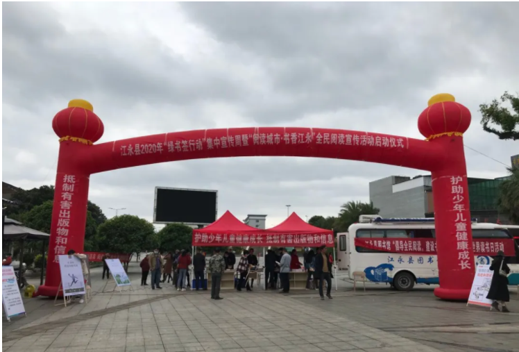 为增强全县青少年儿童知识产权保护意识,在全社会积极倡导全民阅读,营造“善读书、读好书、好读书”的浓厚图书氛围,值第25个“世界图书与版权日”到来之际,江永县委宣传部联合县教育局、县市监局、县文旅广体局、县文化执法大队、县图书馆、县新华书店在知青广场举办“江永县2020年“绿色签行动”集中宣传周暨“阅读城市·书香江永”全民阅读宣传活动。