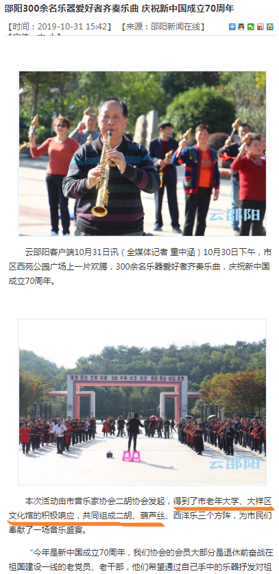 | 大祥区文化馆老年大学庆祝建国70周年 | 大祥区文化馆官网 | 2019年6月29日 | http://info.dxzc.gov.cn/Item/71192.aspx |