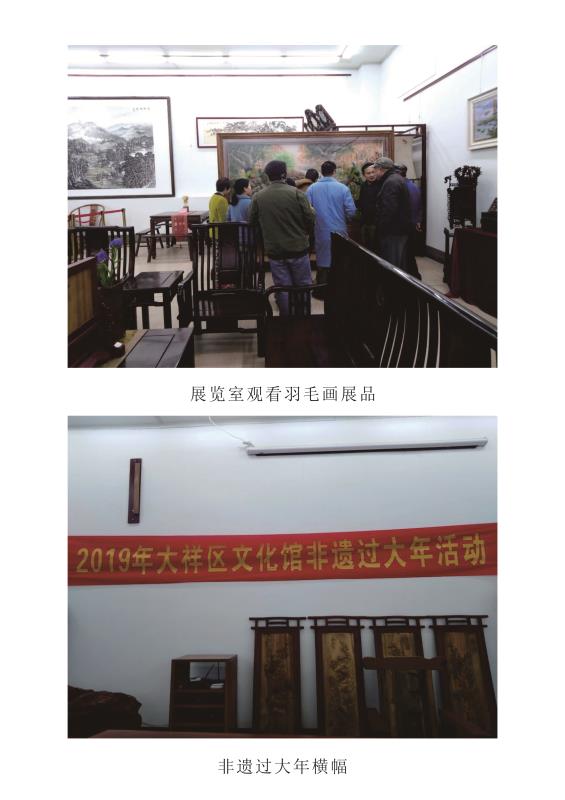 我馆于2019年1月25日在邵阳宝庆号羽毛画展览馆开展“2019年大祥区文化馆非遗过大年活动”,本次活动开展以大祥区非遗宝华_大祥区羽毛画非遗项目为基点,通过羽毛画非遗项目精美展品,市民参观传承人羽毛画制作作坊,传承人现场制作,让市民了解更多羽毛画知识,了解本地历史文化,激发对传统民间文化兴趣,观看中市民纷纷对我区优秀非遗文化赞不绝口。