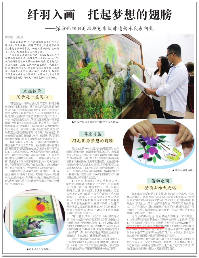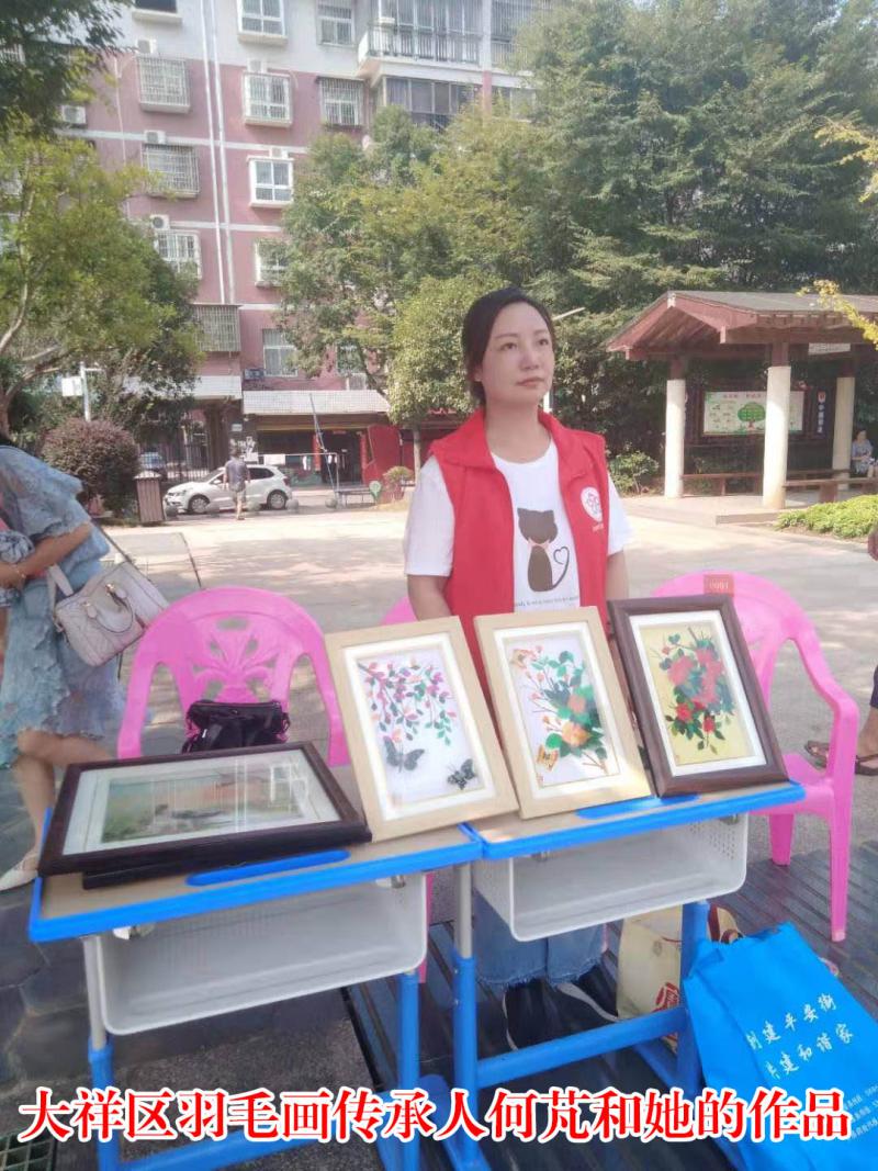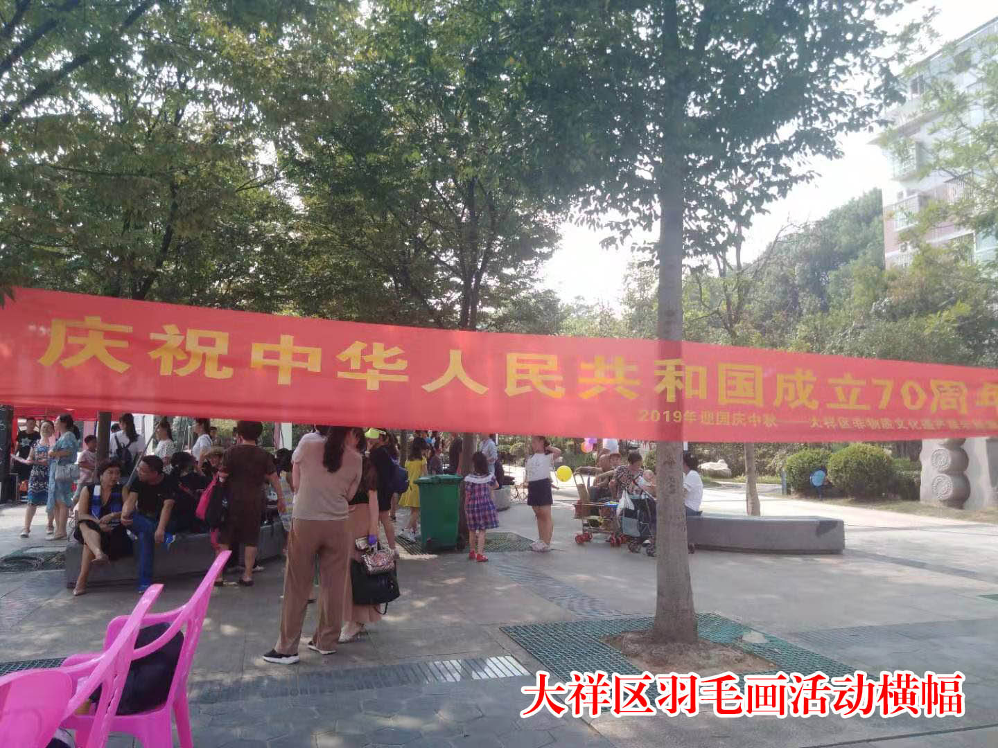 2019年9月11日在大祥区西苑公园举行“庆祝中华人民共和国成立70周年——大祥区非物质文化遗产展示展演”活动,主要是以图片展及群众互动方式让群众真正了解并喜爱我区优秀的非物质文化遗产,展品中五彩缤纷的羽毛画,引发市民的浓厚兴趣,对我区优秀的非物质文化遗产交口称赞,本次活动与文艺演出进行了有机结合,我区群众既欣赏到舞蹈歌曲等丰富多彩的文艺节目,又通过非遗传承人的介绍了解大祥羽毛画的历史与制作过程。