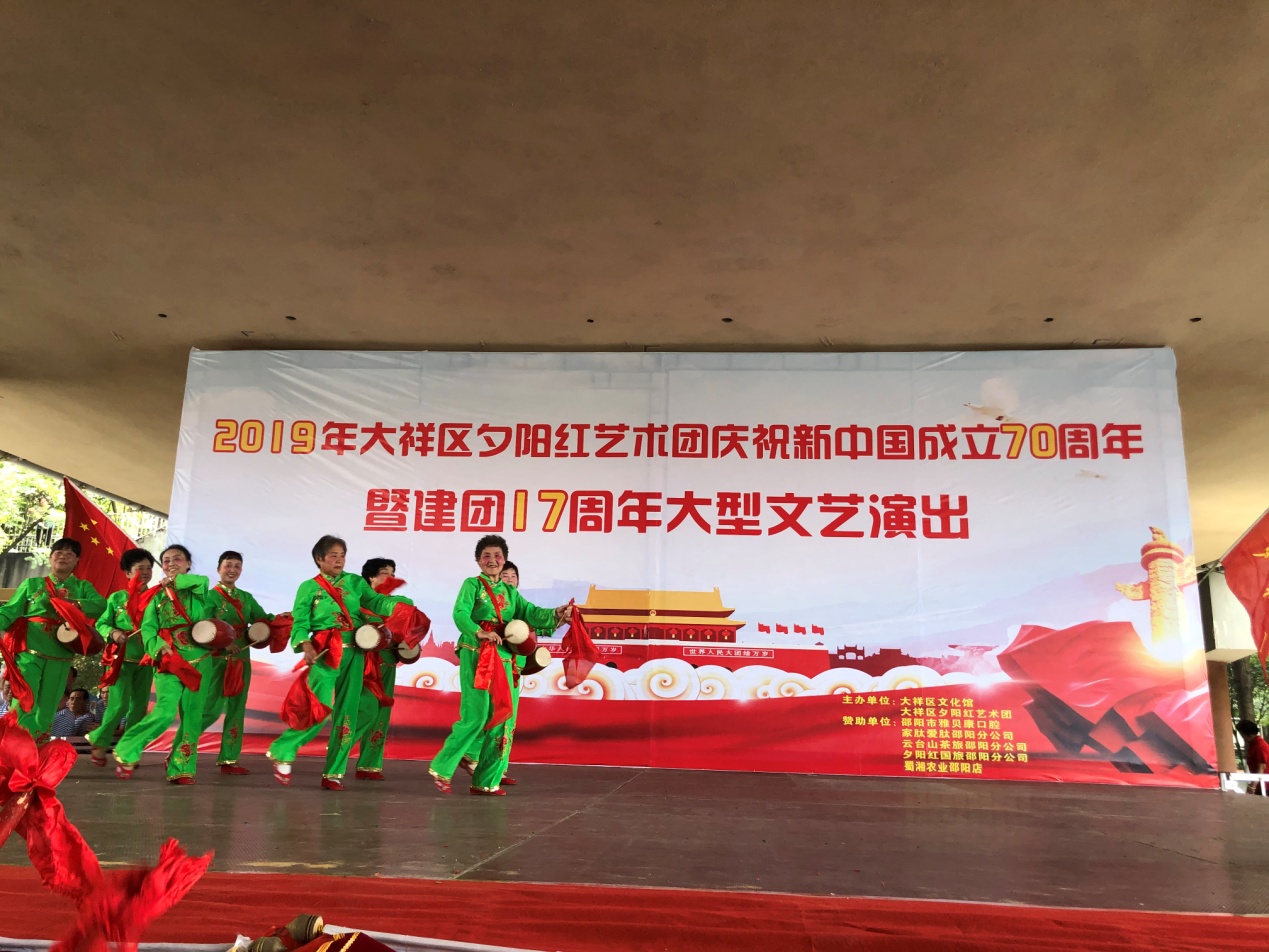 2019年9月27日,西湖桥广场, 大祥区夕阳红艺术团庆祝新中国成立70周年文艺演出隆重举行,这次活动由大祥区文化馆和大祥区夕阳红艺术团和联合举办, 夕阳红艺术团的老年文艺爱好者为各界群众表演了《胜利腰鼓》《歌唱祖国》等精彩节目庆祝伟大祖国的生日到来,现场弥漫着一股浓浓的节日气氛。