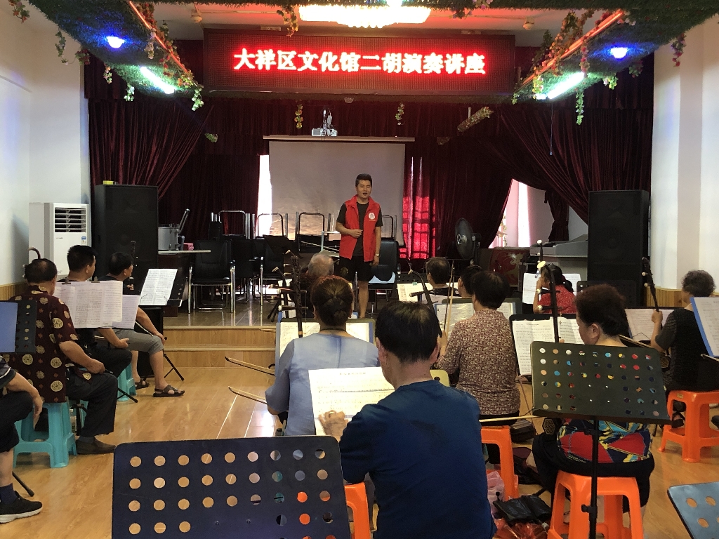 2019年8月12日,为提高大祥区老年艺术团体及文化志愿者团体的二胡演奏水平,大祥区文化志愿者二胡演奏讲座在大祥区文化馆多功能厅开讲。来自邵阳市市音乐家协会的二胡演奏名师岳林老师为二胡演奏爱好者讲解乐理知识,音乐素养,并现场答疑,指导学员练习演奏技巧。