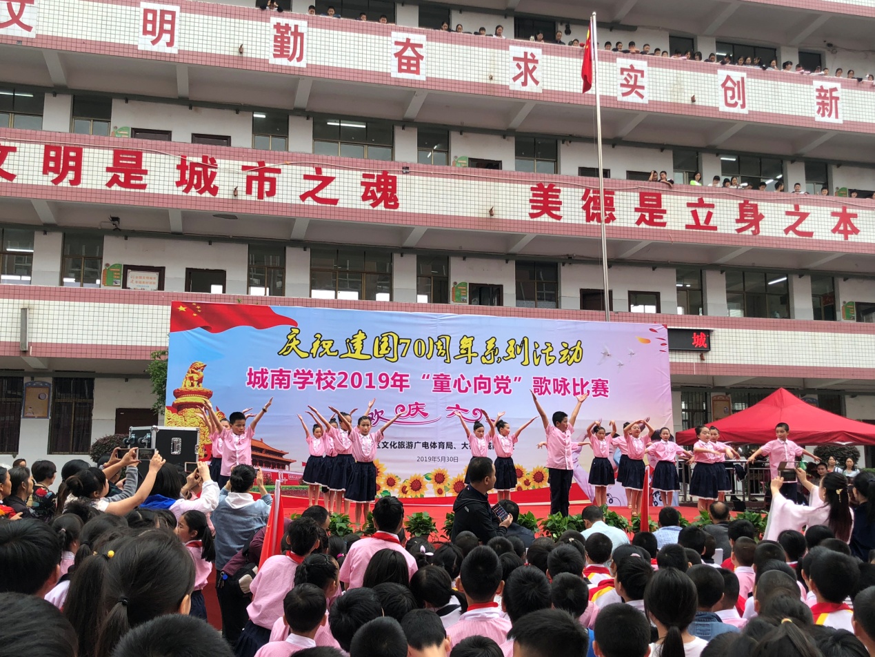 2019年5月30日,在邵阳市城南学校操场, 城南学校2019年“童心向党”歌咏比赛隆重举行,这次活动由大祥文体广新局、大祥区文化馆、邵阳市城南学校联合举办,是庆祝建国70周年系列活动的一部分。比赛现场,可爱的孩子们表演了众多爱国爱党歌曲,表达了对共产党丰功伟绩的歌颂,对伟大祖国的热爱。