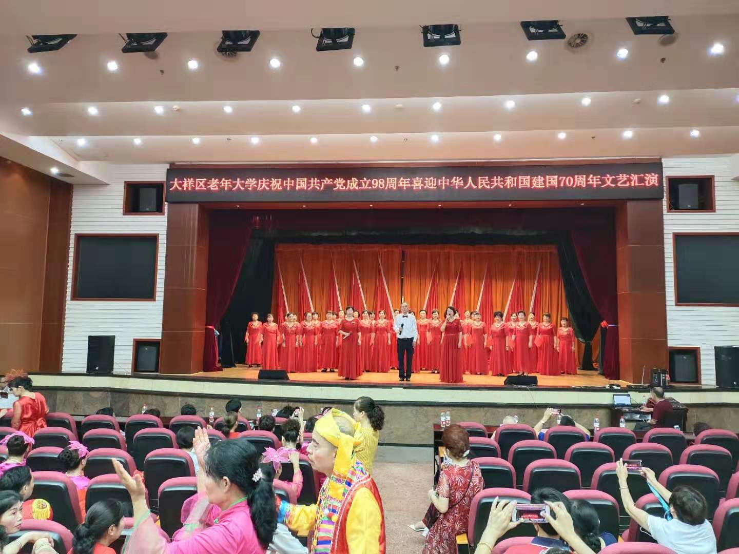 2019年6月28日,在大祥区政府一楼多功能厅,大祥区老年大学庆祝新中国成立70周年文艺汇演火热进行。这次活动由大祥区文虎馆和大祥区老年大学联合主办,来自大祥区老年大学的文艺爱好者们欢聚一堂,用歌舞、合唱、小品等众多精彩节目表达 了对党和国家的歌颂,对美好老年生活的热爱。