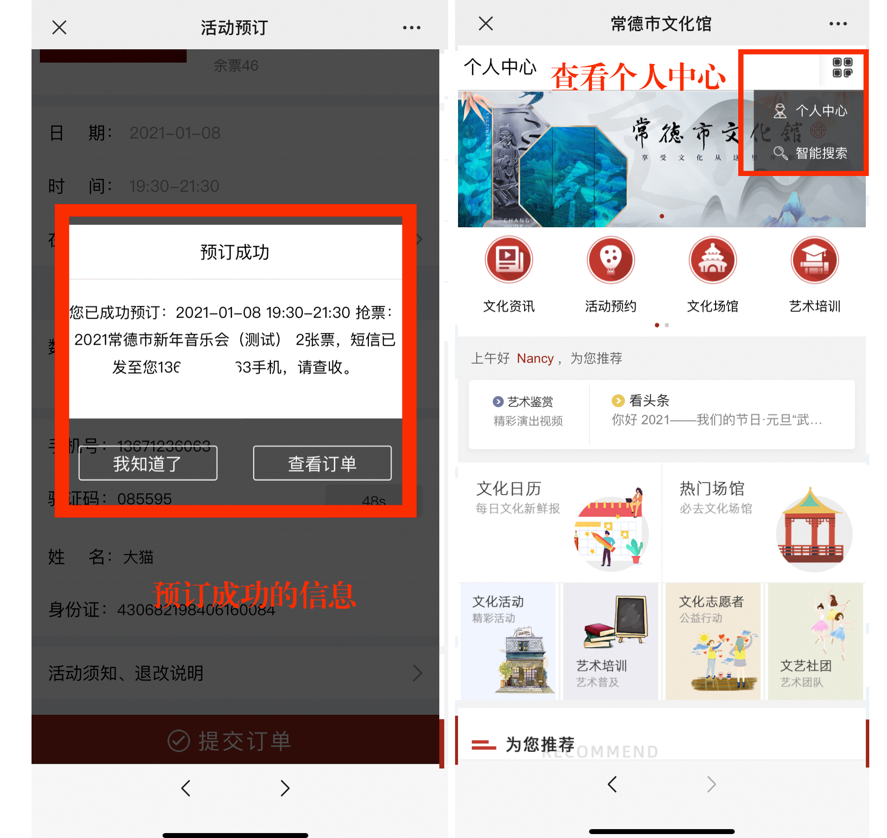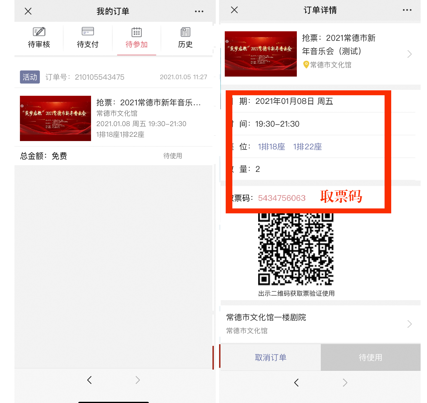 7、查看我的订单,1月8日9:00-17:00前往常德市文化馆一楼服务台,出示订单号码兑换入场券。