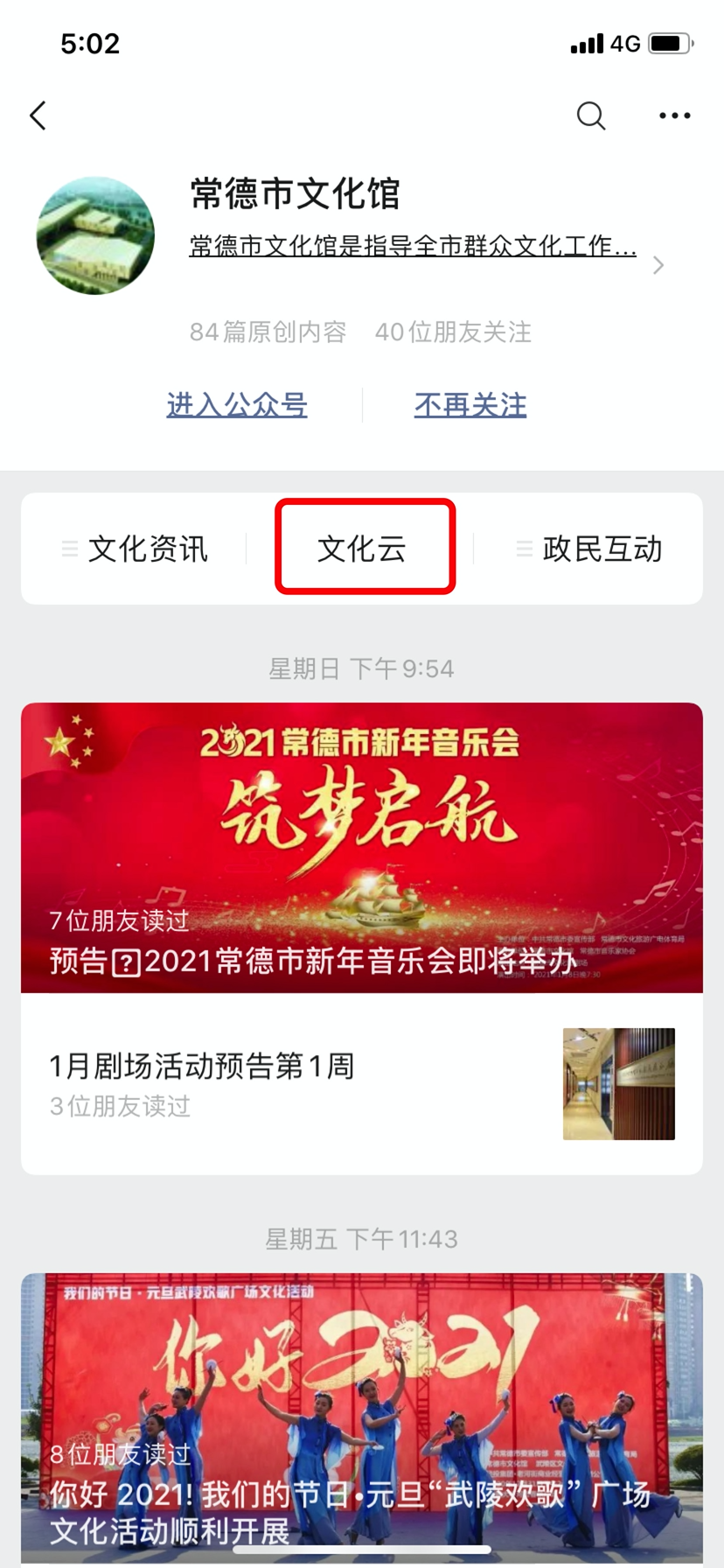方法二:微信搜索“sdwhg”,关注“常德市文化馆”微信公众号,点击菜单“文化云”进入常德市数字文化馆的官网