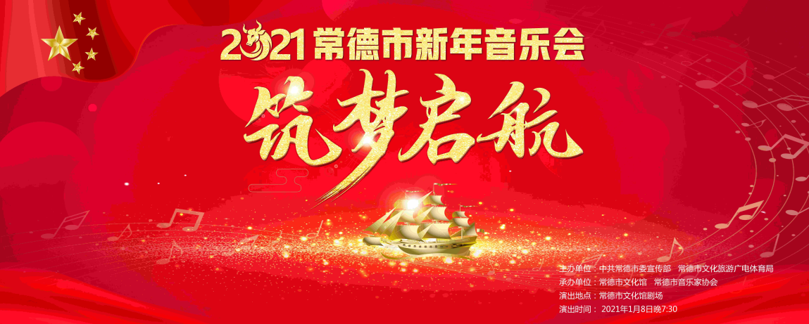 2021年1月8日19:30,由中共常德市委宣传部、常德市文化旅游广电体育局主办,常德市文化馆、常德市音乐家协会承办的“筑梦启航”2021常德市新年音乐会将在常德市文化馆剧场上演。