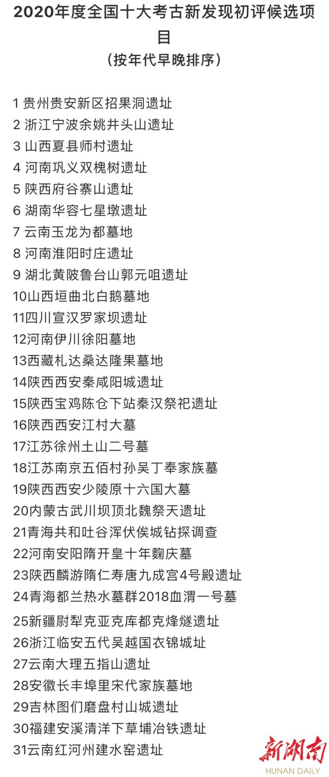 中国文物报社今天发布消息,2020年度全国十大考古新发现评选初评启动。候选项目为各发掘资质单位主动申报的参评项目31项,其中湖南华容七星墩遗址入围初评名单。评选活动办公室将组织投票推荐产生20项项目进入终评。