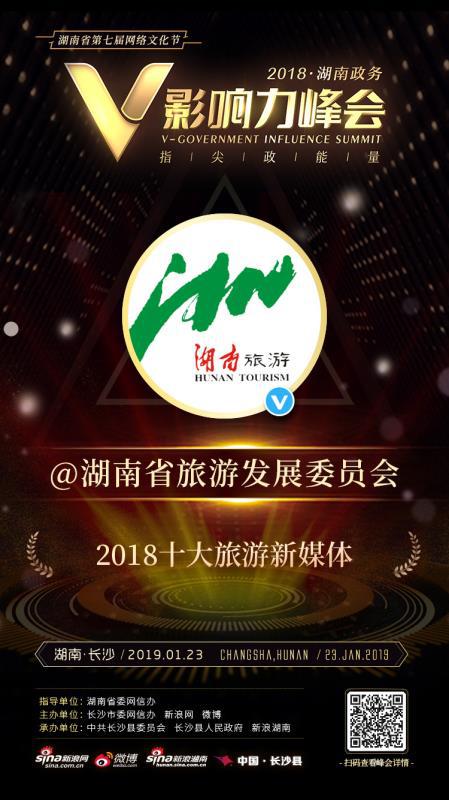 1月23日下午,“2018湖南政务V影响力峰会”在长沙国际会展中心举行,湖南省文化和旅游厅荣获“V影响力贡献奖”、“2018年十大旅游新媒体”两项大奖。