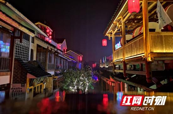 春节临近,湖南张家界市武陵源区溪布老街景区夜间照明景观和节日彩灯陆续点亮起来,雨夜下华丽的轮廓灯形成一条条五颜六色、溢彩璀璨的光带,倒映在积水中美不胜收,以其迷人的姿态喜迎新春的到来。