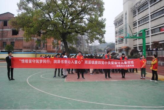 上午8:10少儿图书馆志愿者与唐四完小400多名学生在唐四完小操场举行了开幕式,开幕式上少儿图书馆志愿者做了发言,激励唐四完小的孩子们勤奋读书,志存高远,以书籍充实自我,以知识成就人生。紧接着三位留守儿童学生代表上台分享了他们的读书经历。之后志愿者携留守儿童前往多媒体教室,两名志愿者分别给同学们分享了《鲁滨逊漂流记》和《小王子》的故事。分组进行知识竞赛和制作书签,同学们在志愿者的陪伴下积极踊跃举手回答题目,他们时而认真思考,时而为答对题目而鼓舞欢喜,在竞赛结束后,为他们送上精心准备的小礼品。