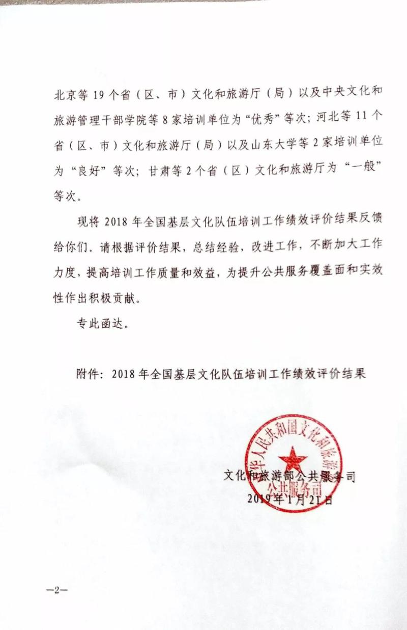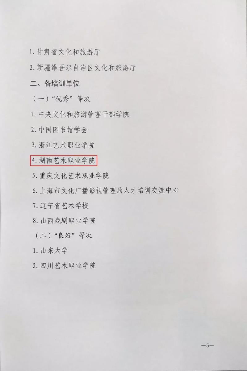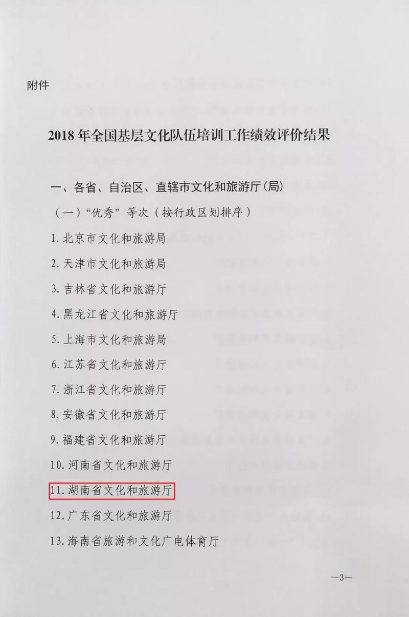 近日,文化和旅游部公共服务司通报了2018年全国基层文化队伍培训工作绩效评价结果,湖南省文化和旅游厅、湖南艺术职业学院分别获评“优秀”等次。