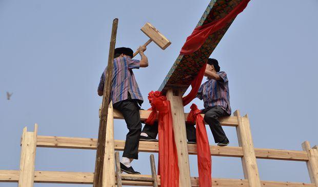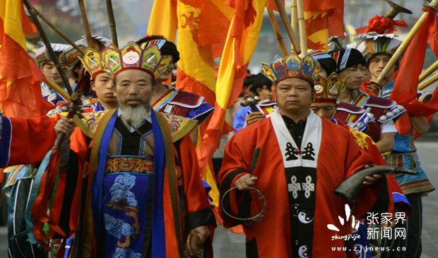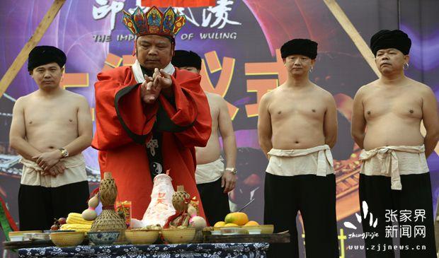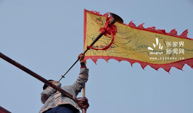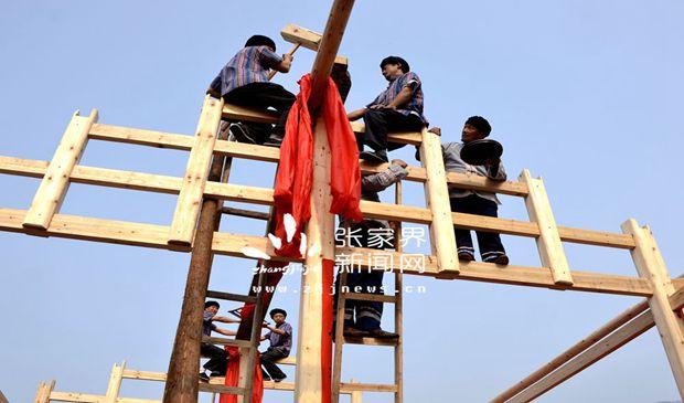 手攀双龙,脚踏云梯,步步登高,节节升起,随着两名土家匠师的一步一吟,位于世界自然遗产地张家界魅力湘西 ;印象武陵;文化广场,百名土家汉子豪情冲天,手捧土碗,仰首祭天,低头祭地,索拉手扶,齐心协力将四个木屋排扇兀地立起,情景蔚为壮观。这是张家界还原狂野的土家民居上梁风俗的精彩一幕。据了解,如此大规模演绎;上梁;文化,在全国尚属首次。
