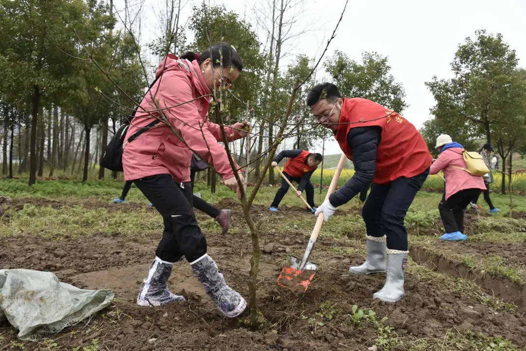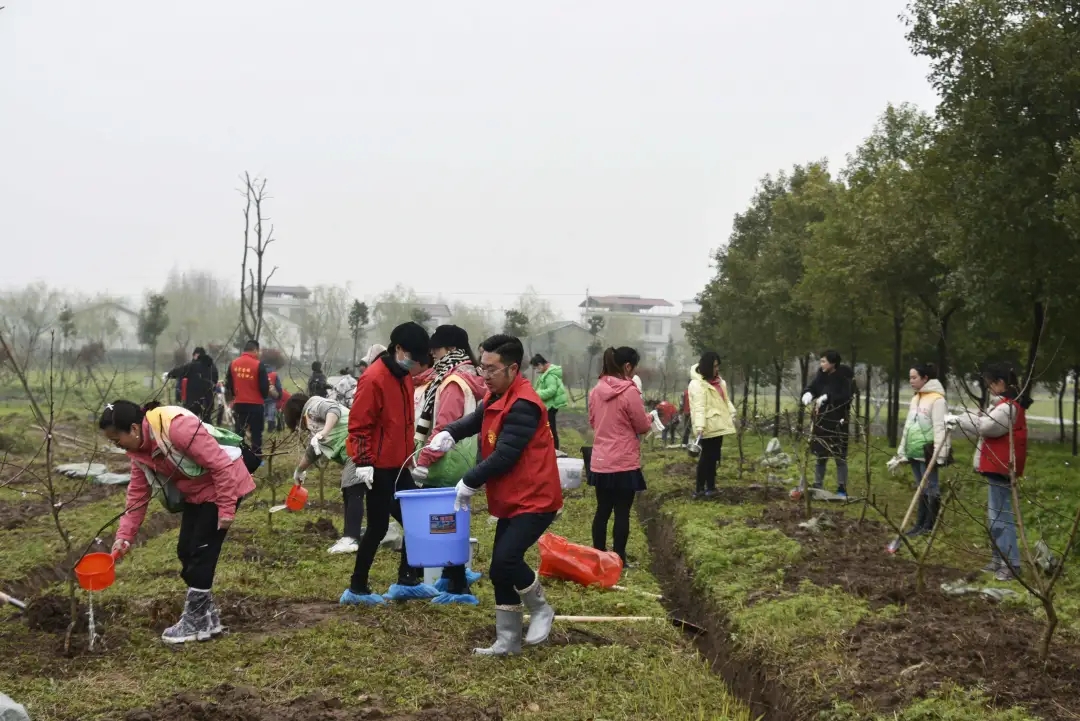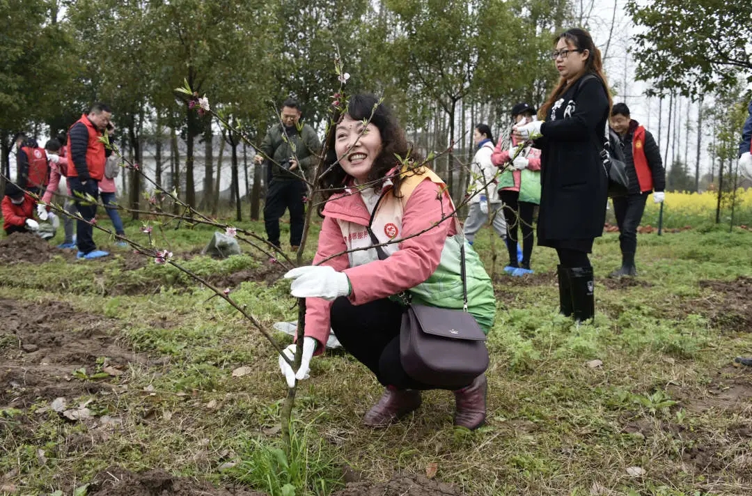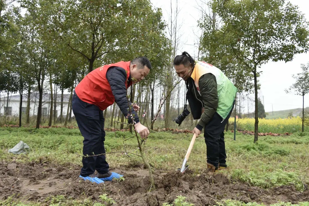 活动中,志愿者们踏着松软潮润的土地,浩浩荡荡来到植树现场,大家精心搭配,分工协作,有的小心翼翼地把带土球的水蜜桃树苗从袋子里拿出来,有的挥锹铲土,有的扶苗助力,有的培土夯实,有的浇水灌溉,经过近一小时的忙碌,近百棵水蜜桃树苗迎风站立,在烟雨飘摇的三月显得格外妩媚动人。