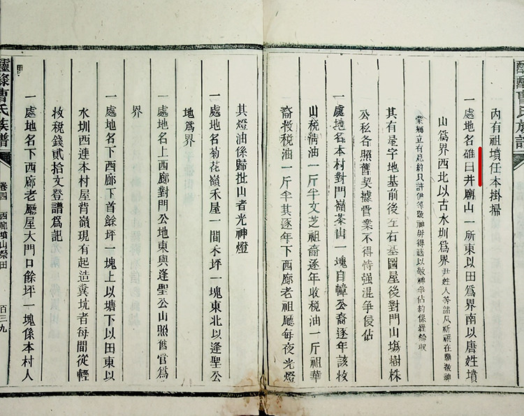《醽醁曹氏族谱·西廊自帏公子孙坟山地名开列于后》中记述:“一处地名碓臼井庙山一所,东以田为界,南以唐姓坟山为界,西北以古水圳为界。尹姓人等,诸凡祈祷在庙敬神,蒙乡立有息约,只许伊等敬神,毋得借以敬神争佔……。其有屋宇地基前后左右,基图屋后对门山场树株,公私各照旧契据管业,不得恃强混争侵佔。”
