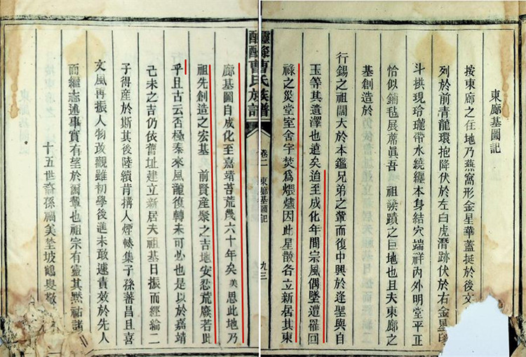 “盖闻……东西两廊,脉发七宝之岭,水储醽醁之泉,分资兴八景之一,为閤邑名胜之冠……”“行锡公籍衡阳,由赐进士授巴州刺史知州。有善政……致仕还乡,嗜清静,携子二麒与森,宋时来宁卜居醽醁东廊立业,子孙蕃衍,乃建造观澜书堂以训族党之少俊……”。