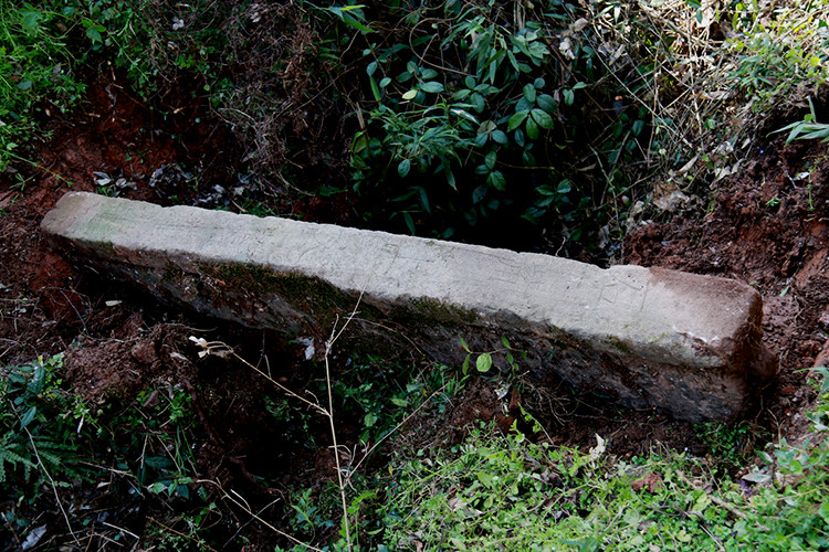 随后,我们在山头寻找寺庙遗迹时,意外发现了一块被人当桥在用的条石上有字,经仔细识读后为“石嘴上文峰蔚起”,根据当地村民讲述及族谱等资料证明,此碑所在的地方名为石嘴上。初步分析这是石嘴上古建筑(或为醽醁寺)的一副对联。该碑的发现,为我们进一步确定醽醁寺、醽醁泉的位置提供了重要证据。