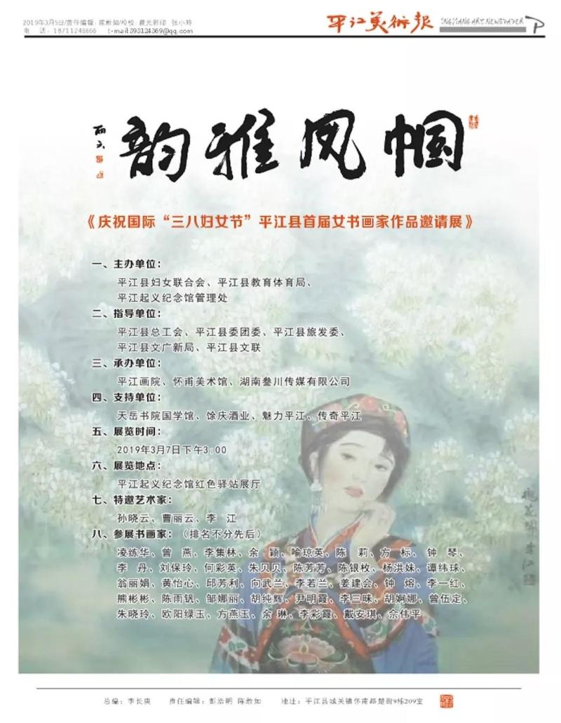阳春三月,伴随着和煦的春风。为充分展示妇女的巾帼风采,3月7日下午,平江举办“帼凤雅韵”首届女书画家们作品邀请展开幕仪式。县团委、妇联、总工会、旅发委、文广新局、平江起义纪念馆、文联、教体局等相关单位参加活动 。