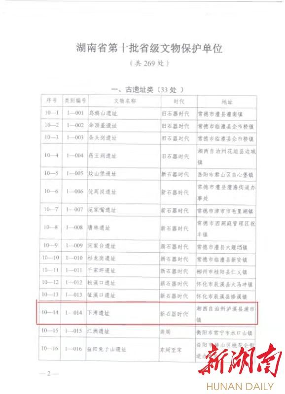 浦市镇下湾遗址(新石器时代)位于浦市镇印家桥社区北,地处沅水中游左岸一级台地,是一处以新石器时代中晚期遗存为主的贝丘遗址,面积约3万平方米。该遗址距今约7800年,跨及新石器、商、汉、宋等多个时期,是沅水流域研究古代环境、社会及文化变迁的重要遗址。