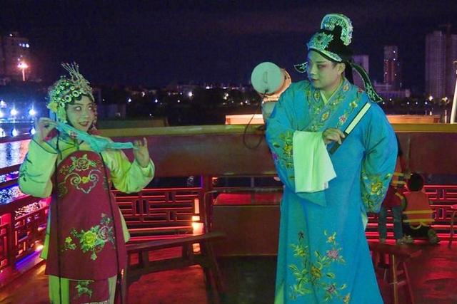 夜幕降临,华灯初上。灯光璀璨的“回龙舫”在东江湾上缓缓航行,此时的游船变身为小型剧场,二层甲板上,演员们在船头演出,悠悠湖水和两岸灯光成为天然背景,精彩的节目表演,引得游客们掌声不断。游客们在游船上一边欣赏传统戏曲艺术,一边饱览东江湾风光,身心在得到了充分的舒缓的同时,也深切感受了资兴的人文风景。