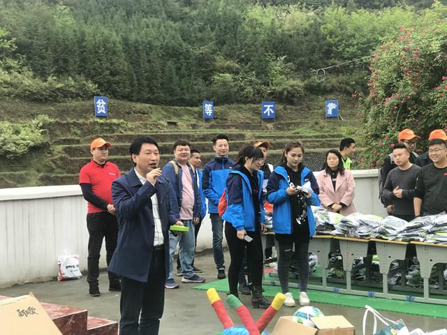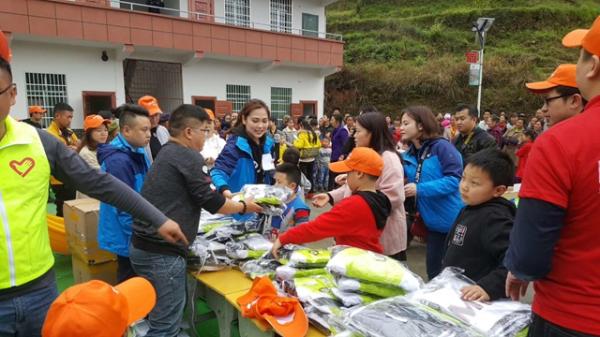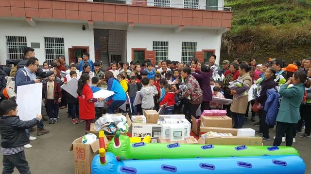 雪峰村小学位于怀化省会同县雪峰乡,当地经济困难,交通闭塞,办学条件十分有限,仅有两个班和唯一一名老师。下午两点,村里40余名学生及家长在教室外的空地集合,企业家代表一对一将衣物鞋帽、益智玩具、智能教学设备等爱心物资分发学校及老师和同学们。