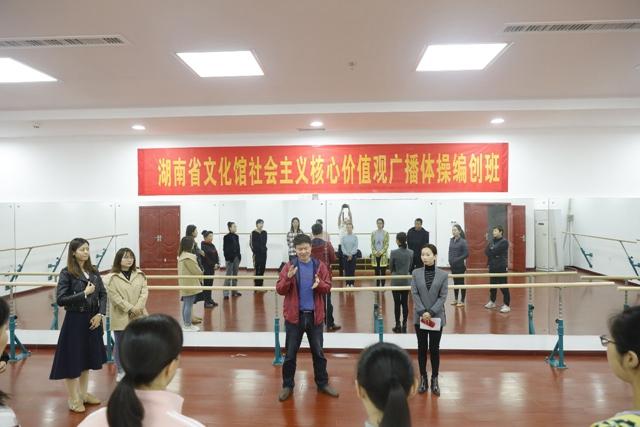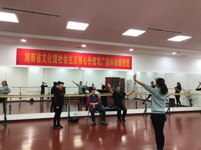 我馆以“富强、民主、文明、和谐、自由、平等、公正、法治、爱国、敬业、诚信、友善”社会主义核心价值观的12个词为主题进行了广播体操的创作。此套教材将舞蹈与广播操相结合,湖湘特色和时尚元素相结合,涵盖了多种湖南民族民间特色、当代流行元素和戏曲元素的特点,是具有多元性、功能性和主题性,并富有深刻内涵的广播体操教材。