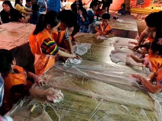 上午9:30分,40名小朋友在老师及家长的带领下准时到达活动现场,工作人员首先介绍了扎染的起源和历史传承:扎染是中国民间传统而独特的染色工艺,是织物在染色时部分结扎起来使之不能着色的一种染色方法。扎染工艺分为扎结和染色两部分,用线在被印染的织物打绞成结后,再进行印染,然后把打绞成结的线拆除。它有无数的变化技法,各有特色,趣味无穷;即使有成千上万朵花,染出后却不会有相同的出现。这种独特的艺术效果,是机械印染工艺难以达到的。