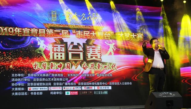 郴州市文旅广体局副局长谭益友宣布“书香名邸”2019年宜章县“礼赞新中国•奋进新时代”第二届市民大舞台才艺大赛首场擂主争夺赛比赛正式开始!
