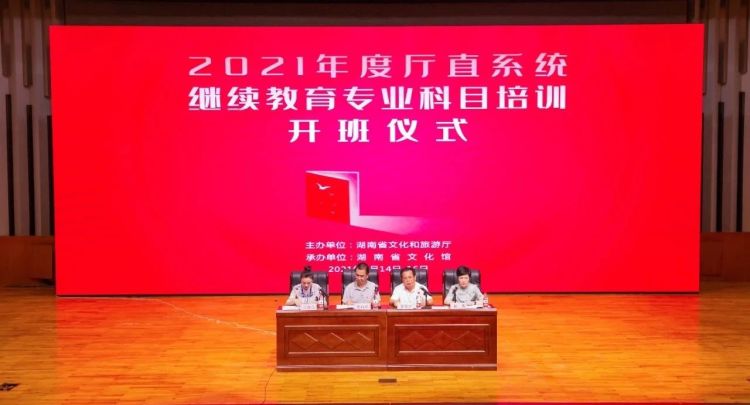 2021年7月14日,由省文化和旅游厅主办、省文化馆承办的2021年厅直系统继续教育专业科目培训班在省文化馆湖南音乐厅举行开班仪式,来自厅直系统的近370位专业技术人员参加了本次培训。省文化和旅游厅科技教育处处长夏日光、副处长黄俊晶、省文化馆党委副书记、副馆长梁向东、纪委书记、副馆长杨菁出席开班仪式。开班仪式由黄俊晶副处长主持。